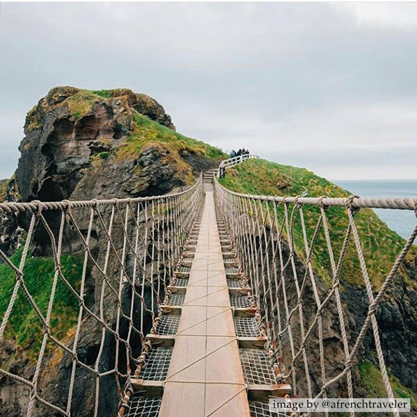 "Jutting out from the rugged North Antrim Coast Road, the 30m-deep and 20m-wide chasm separating Carrick-a-Rede from the mainland is traversed by an amazing rope bridge. This rocky island is the ultimate cliff-top experience, if you are bold enough to make the crossing."